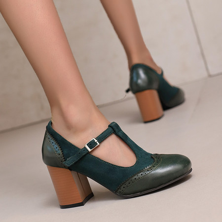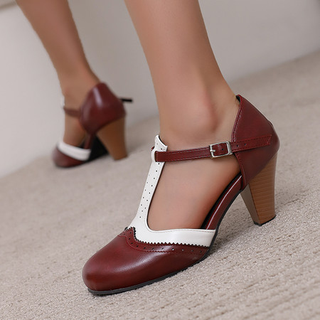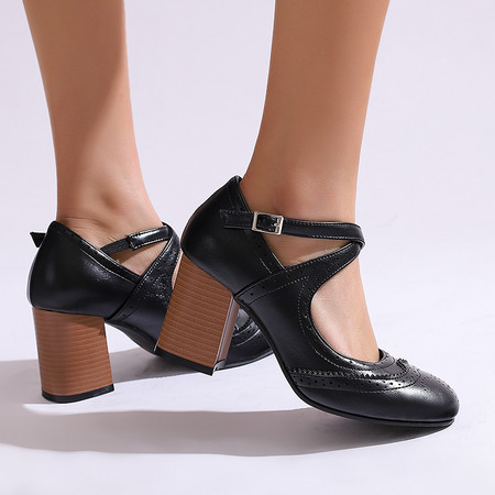 粗跟中国风浅口单鞋珍珠蝴蝶结蕾丝装饰中空女学生鞋子